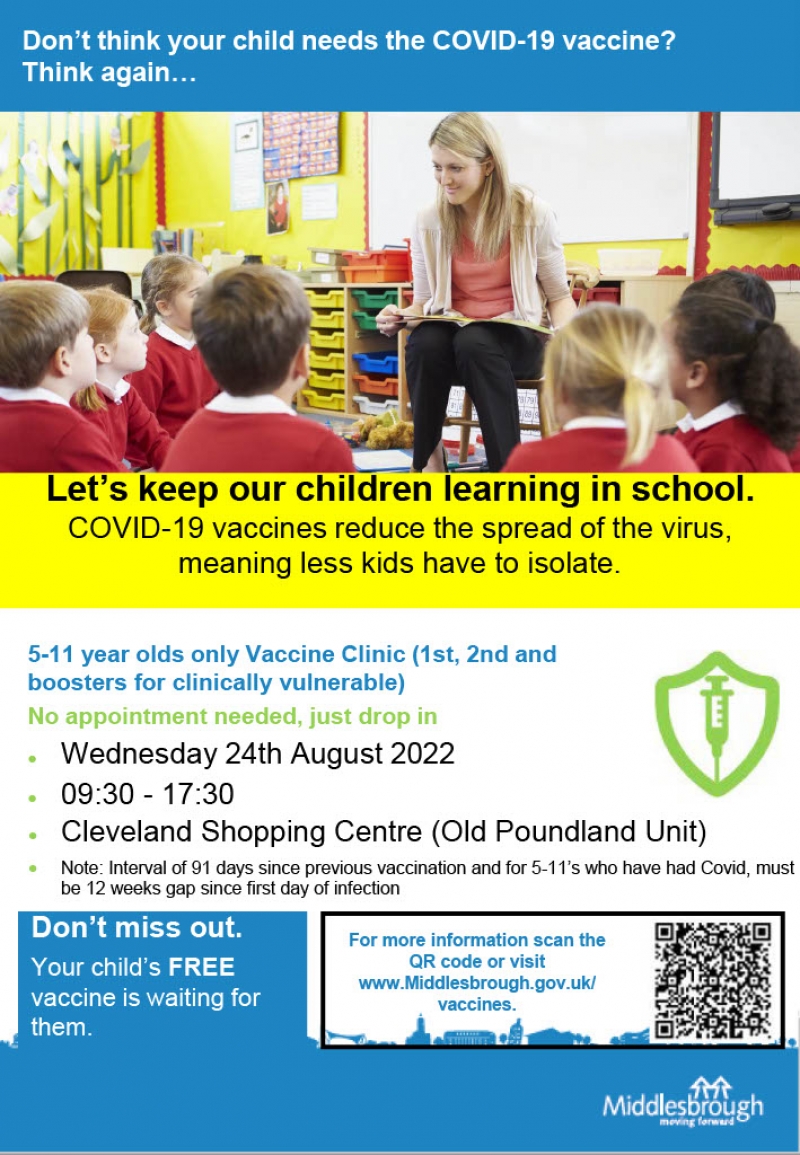 This week in Middlesbrough a special "Back to School" Vaccine clinic on Wednesday 24th August in the usual spot at the Cleveland Centre - this is for 5-11 yr olds only for their 1st, 2nd (or boosters for any who are clinically vulnerable) jabs.